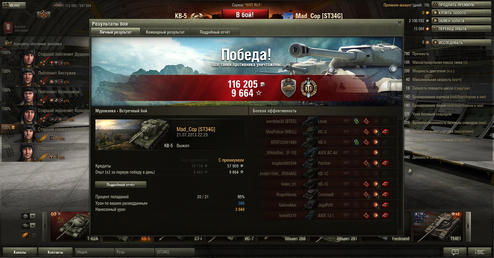КВ-5 купил как первый прем. Боёв у меня на нём ещё совсем мало, но кое-какое мнение уже сформировалось. Что могу о нём сказать? Танк не однозначный. Броня есть, но сильно "дырявая", пушка слабая. Все, даже самые плохие игроки, знают его "больные" места. В последнее время очень редко оказываюсь в верху списка. Введение сербоголды ещё больше усложнило ситуацию, его стали шить даже те, кого изначально никогда не боялся. Но. Как неоднократно уже заметили - этот танк, если есть желание на нём играть, очень здорово прямит руки. Таран - наше всё. Только на нём начал задумываться о точках пробития, изучать ТТХ других танков и их слабые стороны. Начал учиться танковать бортом, и, что характерно для КВ-5 и особо радует, кормой. До этого о таких вещах не задумывался, палил чисто в силуэт, и, о чудо, неожиданно легче и лучше стало получаться играть на всех танках. А если учесть, что танк не напрягаясь позволяет ещё фармить и качать экипаж, то моё мнение, что танк годный.
