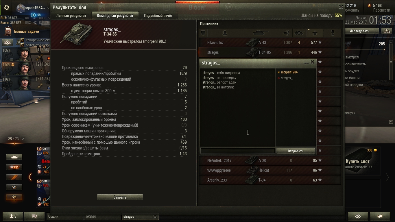 играю я такой вчера на шведе премиумном потихоньку набиваю зевакам лица и тут после боя пишет мне обиженый жизнью игрок у котарого 6,5 к боёв на т-34 85 на нём-же я его и слил)))