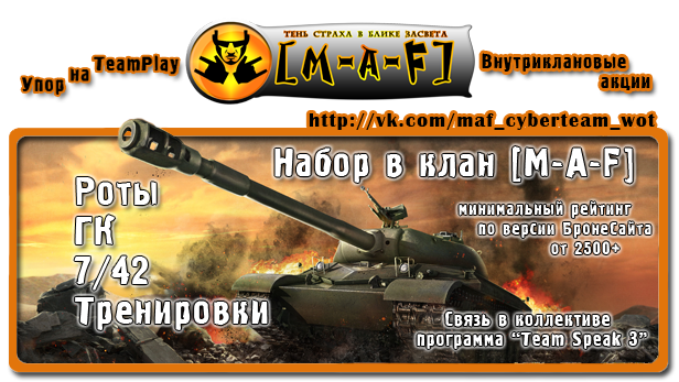 - в заявке указать игровой ник, часовой пояс, и время удобное для собеседования. Альтернативный адрес для заявок http://vk.com/maf_cyberteam_wot