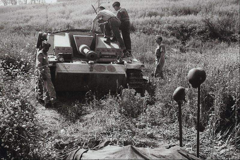 Союзники осматривают немецкое штурмовое орудие StuG 40 Ausf. G, на земле видны тела двух немецких солдат.