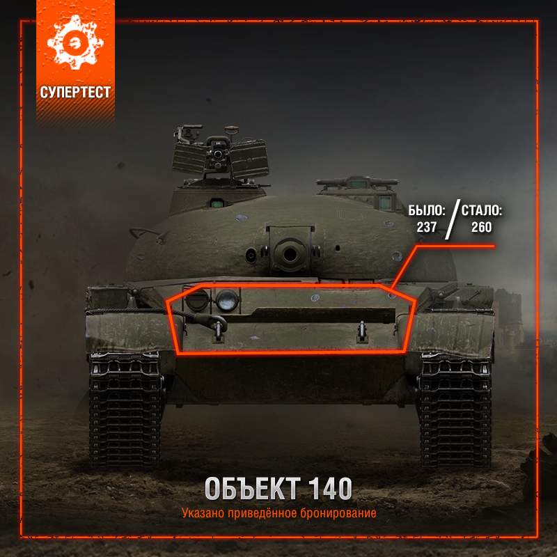 Советский Объект 140 в целом сбалансированная машина, однако и ему не помешает небольшое улучшение характеристих комфорта стрельбы и живучести. Угол склонения орудия будет увеличен с -6 до -7 градусов, а приведённое бронирование ВЛД возрастёт с 237 до 260 мм. Это позволит танку увереннее противостоять атакам одноклассников и более агрессивно действовать в бою.