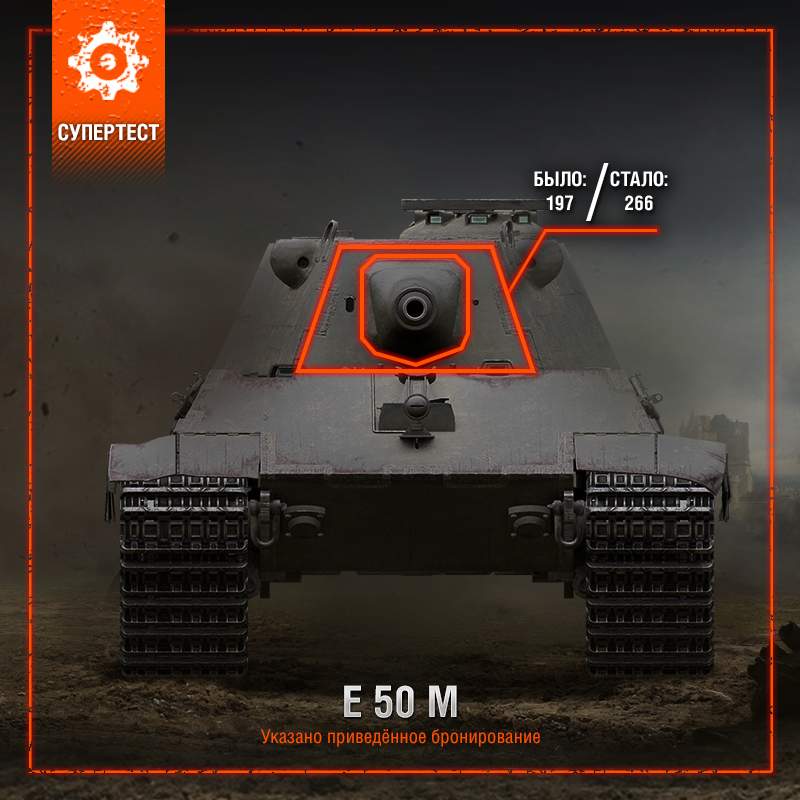 Из двух немецких средних танков десятого уровня E-50M – наиболее защищённый и живучий. Фронтальное бронирование роднит его скорее с тяжёлыми танками. Тем не менее, толщина лобового бронелиста башни не позволяет выдерживать удары высокоуровневых противников. Мы планируем усилить защиту этой области, подняв толщину приведённого бронирования лба башни со 197 до 266 мм.