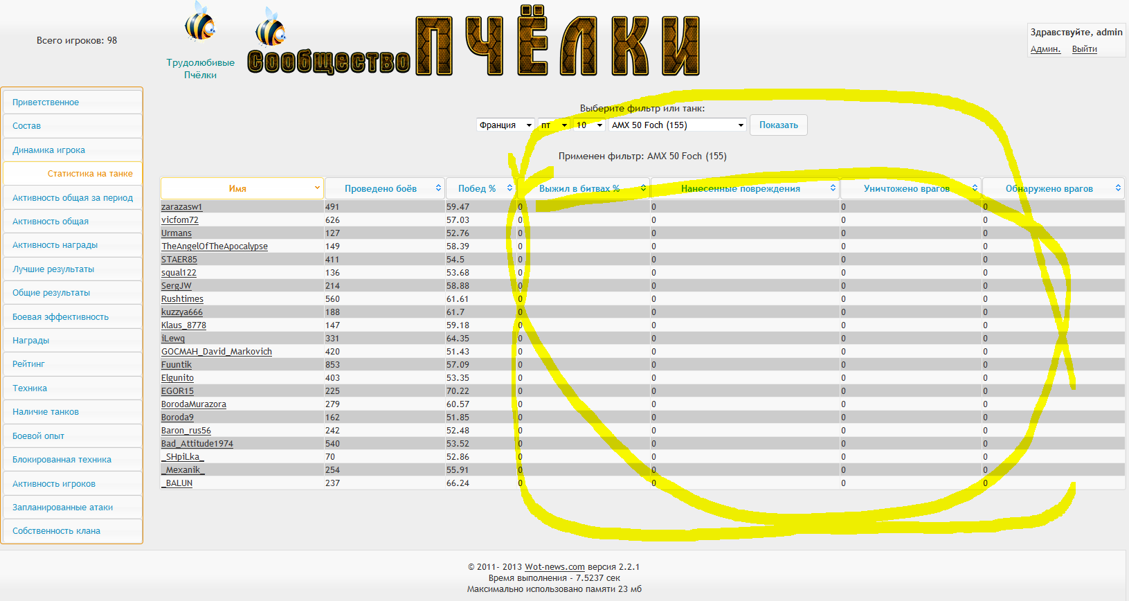 NightAngel писал(а):На закладке "Статистика на танке" во всех разделах, кроме "Проведено боев" и "Процент побед" - показываются нули