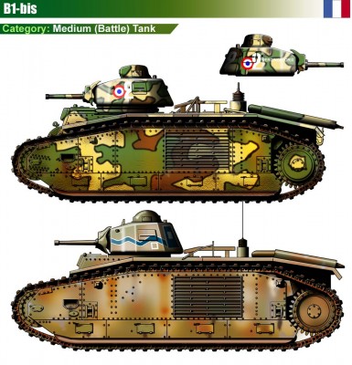 Танк B1 bis. - модификация производилась с 1937 г. и составляла основу вооружения танковых батальонов французской армии в 1940 году. По сравнению со своим предшественником танк B1 bis. имел усиленное до 60 мм бронирование и башню нового типа АРХ4. 6-цилиндровый карбюраторный двигатель «Рено» который позволял танку развивать максимальную скорость 28 км/ч. Выпущено 363 единиц.