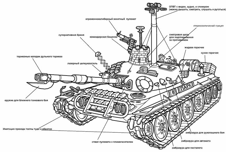 4. Бортовые системы - система распознавания Свой - чужой, независимая зенитная система (никто из членов экипажа не отвлекается на появление чужой вертушки, все заняты своим делом), система "Прозрачная кабина" командир видит все происходящее на поле боя, соответственно мехвод тоже. Наводчика нет, его обязанностями занята бортовая система, выстрелы и выбор цели производит командир. (размещены в центре танка со смещением к корме за снарядами)