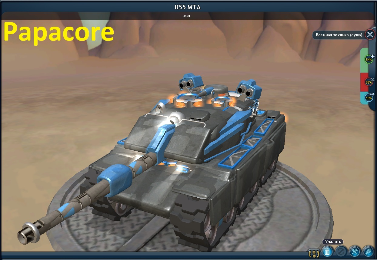 Французский средний танк на воздушной подушке не столь отдалённого будущего, приводится в движение двумя электрическими турбинами, может двигаться на высоте полуметра над ровной местностью и водоёмами, перелетать над небольшими препятствиями. В корме располагается ядерная силовая установка, а в передней части корпуса аккумуляторная батарея, заряжаемая на холостом ходу установки. Посредине расположена рубка и башня, в которых размещаются 3 члена экипажа. Бронирование относительно слабое, но лоб корпуса и рубка имеют реактивную взрывную броню. Вооружён 150-мм пушкой гаусса, снаряды не имеют гильз.