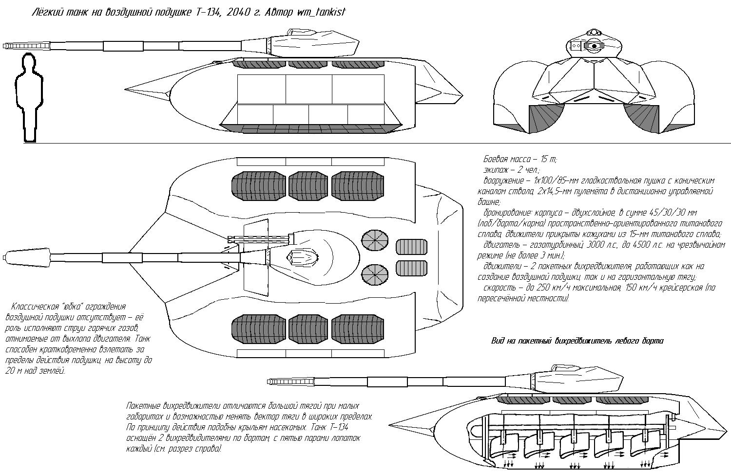 Лёгкий танк на воздушной подушке Т-134, 2040 г. Принят на вооружение ВДВ и морской пехоты. Основное назначение - огневая поддержка воздушных и морских десантов, борьба с бронетехникой противника.