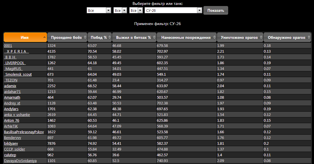 UPDATE `u266895746_wn220`.`msfc_tanks` SET `tank` = 'AMX-50 Foch (155)' WHERE `msfc_tanks`.`id` =205;shw писал(а):Нужен ли данный таб, если он показывает только кол-во боев и процент побед?