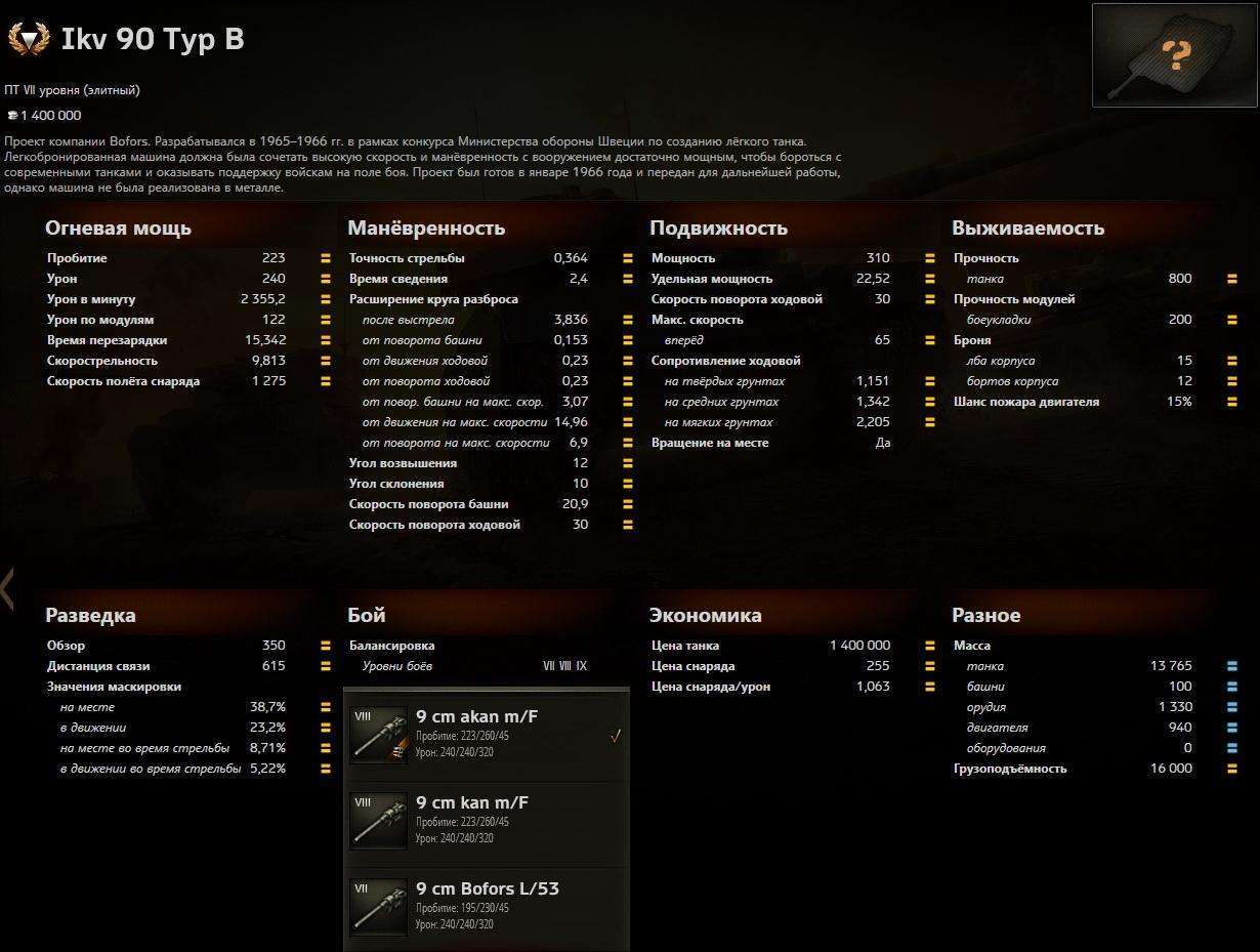 Шведская ПТ-САУ 7-го уровня - IKV 90 B. Это небольшая, слабо бронированная машина, с максимальной скоростью 65 км/ч и хорошей разгонной динамикой, но не самой лучшей маневренностью.
