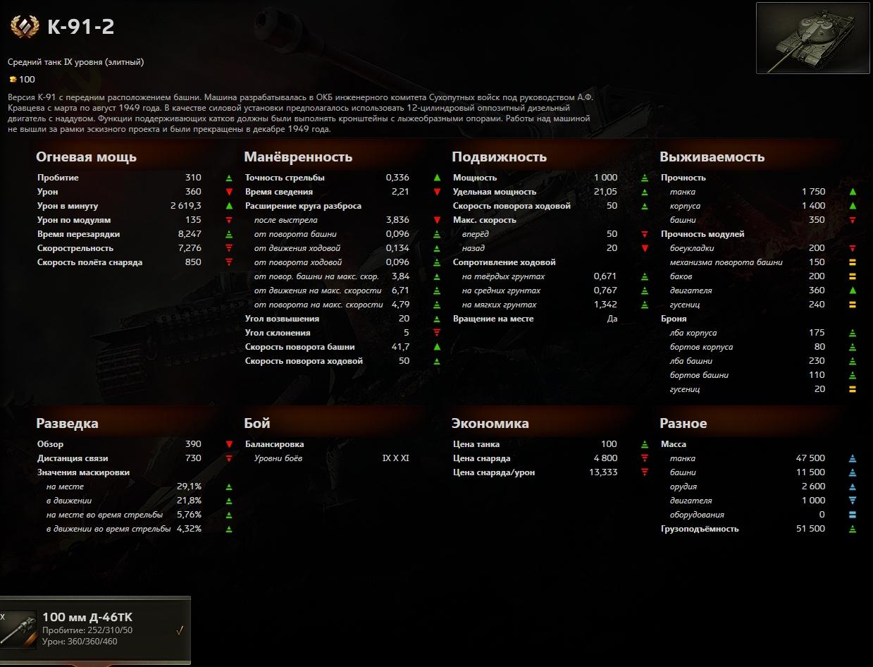 Орудие обладает разовым уроном в 360 единиц и перезаряжается 8,6 с. Точность составляет 0,35, время прицеливания – 2,3 с. Стандартный подкалиберный снаряд пробивает 252 мм, а специальный кумулятивный 310 мм. Базовый обзор 390 м. Танк обладает высокой динамикой, тяговооружённость равна 21,1 л.с./т. Максимальная скорость 55 км/ч.