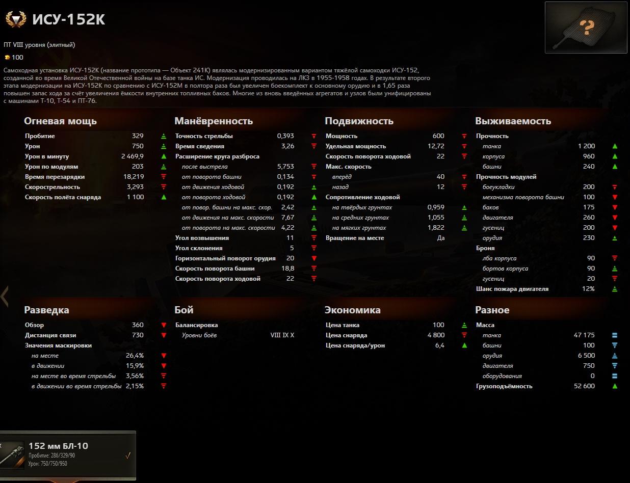 ИСУ-152К очень похожа на обычную ИСУ-152. Различия невелики: чуть лучшие углы горизонтальной наводки, выше бронепробиваемость, но динамические характеристики и скорострельность немного уступают прокачиваемому аналогу. К этой машине не придётся привыкать, ведь стиль её боя – засадная ПТ-САУ с высоким разовым уроном – давно известен большинству игроков.