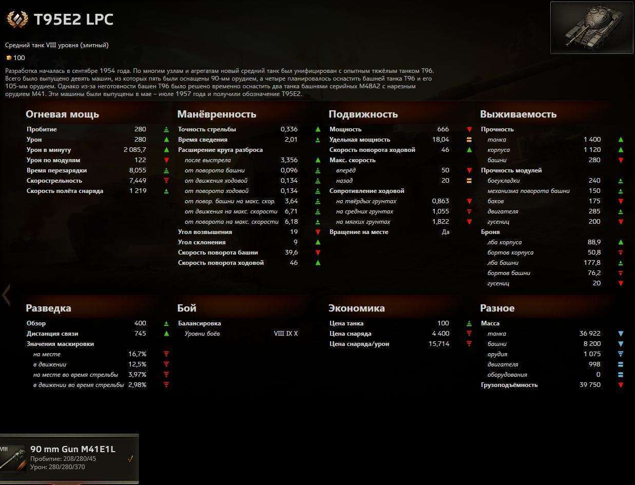 Орудие калибра 90 миллиметров имеет хорошие показатели бронепробиваемости: 205 миллиметров для стандартного бронебойного снаряда и 255 для специального подкалиберного. Скорострельность и урон – 6,9 выстрелов в минуту и 240 единиц соответственно. Стабилизация орудия достойная, скорость сведения – 2 секунды, а точность равна 0,44. Угол склонения орудия вниз – 9 градусов.