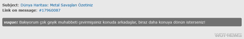 In this section you'll find posts from the official developers forum. The base is updated every hour and stored on a server wot-news.com. If you encounter any bugs, have suggestions or comments, write to info@wot-news.com