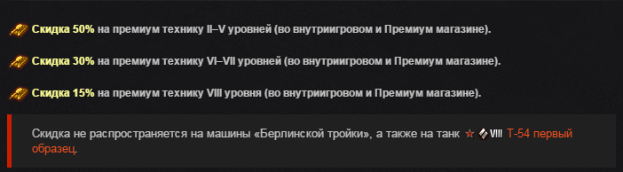 Просмотр сообщенияBelkien (08 Май 2015 - 10:04) писал: Подскажите почему нету скидки на 54-1 в рамках акции "С днем победы"?
