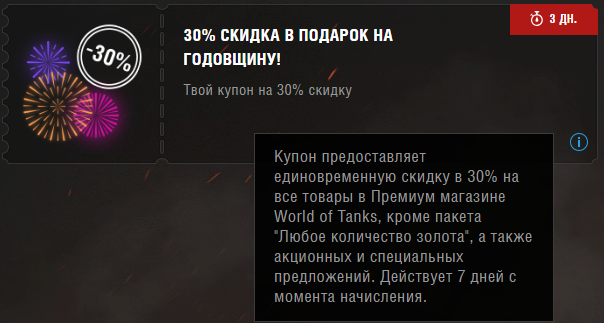 Icetop (08 Май 2018 - 12:27) писал: а где мой купон на 30% где его смотреть? а все год еще ждатьADckii: Проверить есть ли у вас купон можно тут: https://ru.wargaming.net/shop/coupons/