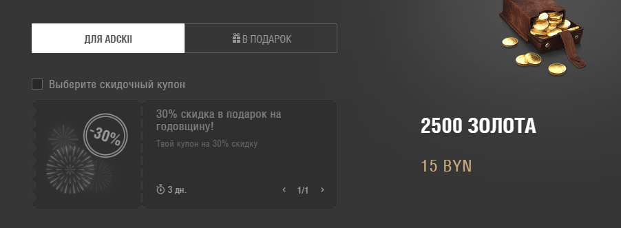 скидки 550р получаетсяADckii: Если у вас есть 30% купон, то можете приобрести 2500 голды со