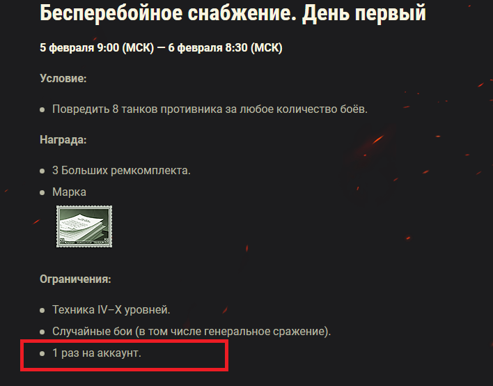 Corspe:   Вас ожидают ежедневные боевые задачи, которые будут обновляться каждый день с понедельника по пятницу. Выполняйте их, зарабатывайте призы — а заодно и марки, которые позволят выполнить две общие боевые задачи с более ценными наградами.