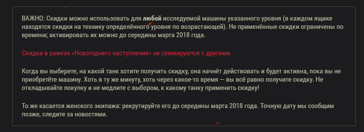 Просмотр сообщения____Soul_____ (03 Янв 2018 - 19:14) писал: Подскажите кто знает, до какого числа нужно рекрутировать девочек и активировать скидку на нужный танк, что бы не пропали? Хочется закинуть экипаж на новую ветку ТТ СССР.