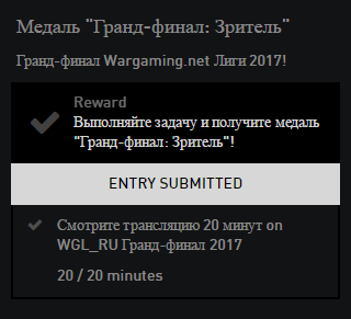Excelion:   Ясно-понятно. Если в соцсетях не зарегистрирован - то мимо. Спасибо, картошка! Как обычно, все для игроков. Медаль «Гранд-финал: Зритель» Условия: Всё очень просто: посмотрите трансляцию 20 минут и получите медаль «Гранд-финал: Зритель». Этот квест можно выполнить один раз в день. Таким образом, за 4 дня трансляции можно получить 4 медали.