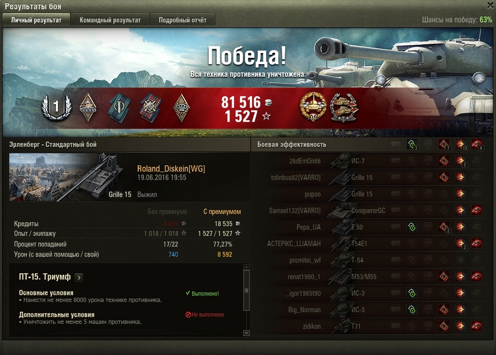Roland_Diskein: ПТ-15 зашла, но увы, не дали 5 фраг сделать :( 385 боев на Гриле, 2 из них были по овер 8к дажки.