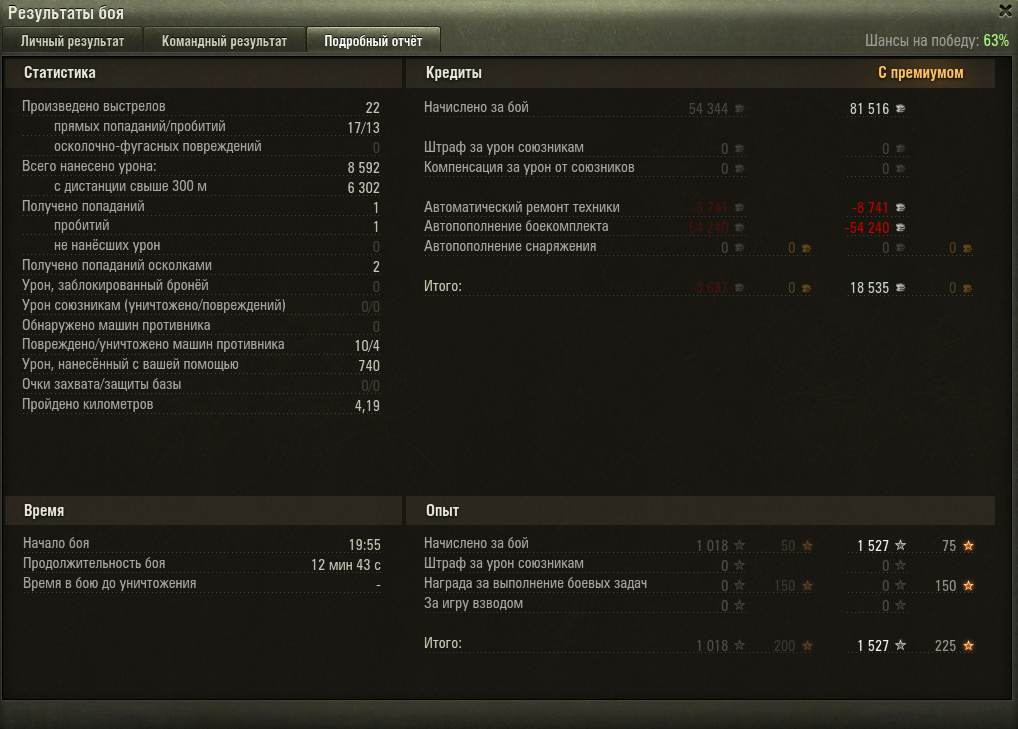 Просмотр сообщенияlx2 (19 Июн 2016 - 17:25) писал: судя по всему, баки ты ему выбил последним выстрелом, одновременно с уничтожением. как следствие - танк не горел.  как следствие - ЛБЗ не выполнено.