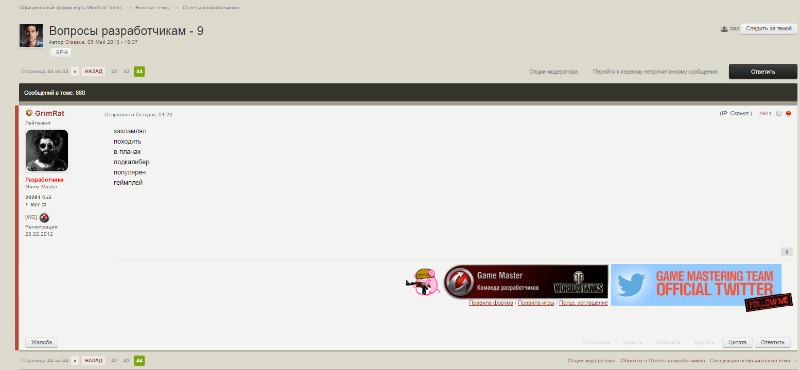 Просмотр сообщенияseryoga_sgb (09 Апр 2016 - 00:38) писал: С чего это я... Зашел значит почтитать ответы от уважаемого Шторма в соотвецтвующую тему, читаю, делаю выводы. Пока не обратил внимания на кучи звездочек в обычных словах *** - я про них.   И так, получился забавный каламбур, я долго угарал, как простые слова "стали" нецензурными, частично. Слово захламлял, то есть занимал лишнее пространство, некий объект. пишем слитно и вуаля - захла***л! Едем дальше! Далее шел комент о том, что прототипы танков на бумаге и игровые аналоги должны быть схожими, здесь было написано походиить (быть похожим) - пишем целиком и азаза - ***одить! Следуем и изучаем что потом! Кто-то спросил о планах разработчиков о введении некой функцыи, употребив невинный термин - в планах,  ну, у меня в ин на утро пойти на работу, все в норме, но пишем слитно и я пацталом! в пла***!   А сем стреляют голдострелы? Подкалиберами - верно! Офигенные снаряды, да вот тока у нас на форуме раскрыли, чем вместо пороха их набили - ну-ка угадайте? под***ибер, из чего же твоя начинка?   И немного о популярности режимов в игре, режимы у нас очень такие, особенно ****лярен Превосходство!   А чтоже с игровым Gameплеем на форуме? Он у нас нетрадициональный, просто опять упал со стула от припадков смеха, ***мплей, такой у нас ***мплей! Я уже не говорю о логике форума и начинке русского варианта GameMaster :teethhappy: В опщем, буду еще чаще читать форум и угарать с таких "запрещенных" слов на форуме! Именно в той теме! Давайте ишшо!   Кто не понял фишки - ищите перлы тут http://forum.worldof...чикам-9/unread/   Я никого не критикую, наоборот, прошу двинуть данную фишку по всему форуму, а не в том разделе, ведь будет в разы больше позитива, игроки хоть перестанут частичто вайнить, угарая с таких забавных моментов! Иле это такая Первоапрельская шутка была?