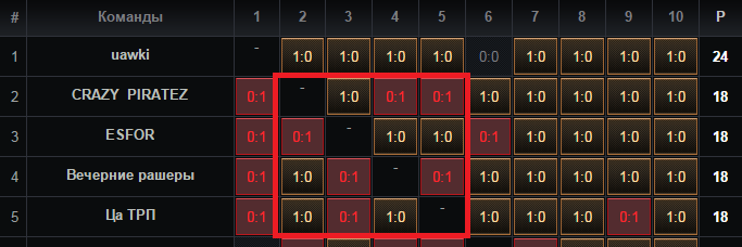 Peachy: Конечно. Смотрите картинку под спойлером:   При разборе подобных ситуаций мы смотрим все личные встречи соперничающих команд, они выделены красным квадратом. Как видно, у команд "ESFOR" и "Ца ТРП" по две победы, тогда как у "CRAZY_PIRATEZ" и "Вечерние рашеры" - по одной. Таким образом, "ESFOR" и "Ца ТРП" спорят за 2-3 место, а "CRAZY_PIRATEZ" и "Вечерние рашеры" за 4-5. "ESFOR" выиграли личную встречу у "Ца ТРП" и занимают второе место. "Вечерние рашеры" выиграли личную встречу у "CRAZY_PIRATEZ" и занимают 4 место.