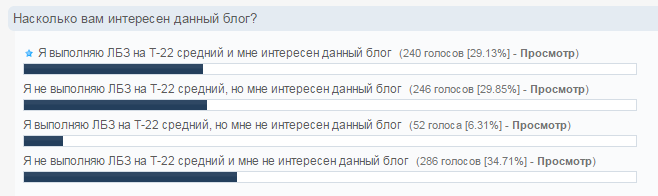 Просмотр сообщения__B3pbIBoTexHuk__ (29 Дек 2015 - 14:39) писал: Здравствуйте уважаемые друзья, хотелось бы у слышать от разработчика, для чего он ведет ни кому не нужный блог История о том, как ADckii разработчик выполняет ЛБЗ? Согласно результатам голосования, большиство говорит-что это флуд, почему тогда тему не скрывать как ни кому не нужную? Я не выполняю ЛБЗ на Т-22 средний и мне не интересен данный блог (278 голосов [34.28%] - Просмотр)