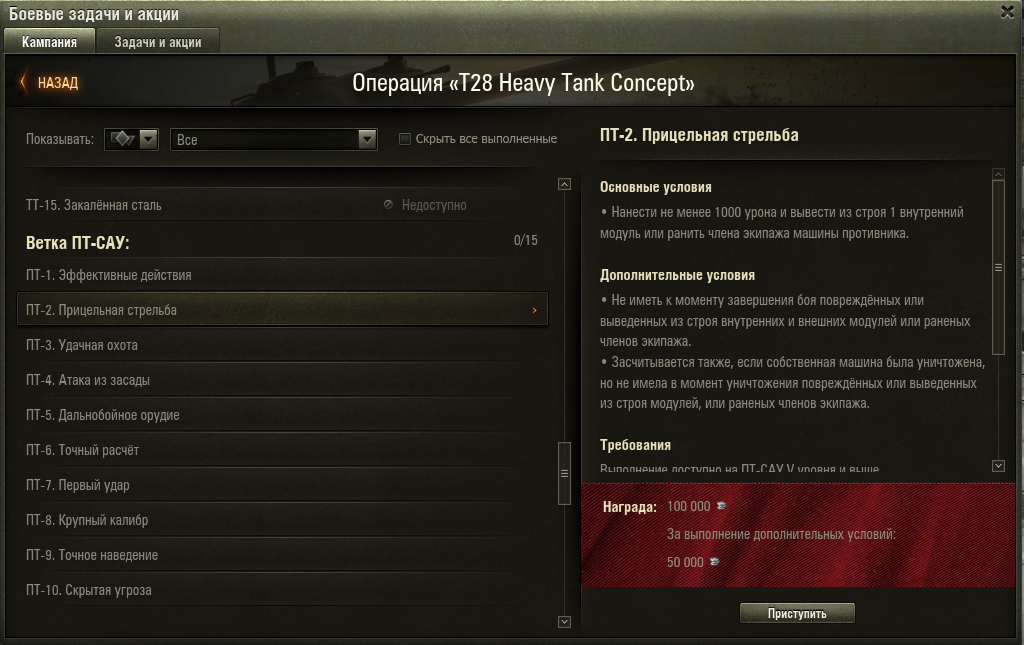 нанести урон по САУ). Выжить в бою. Победить в бою. Большая