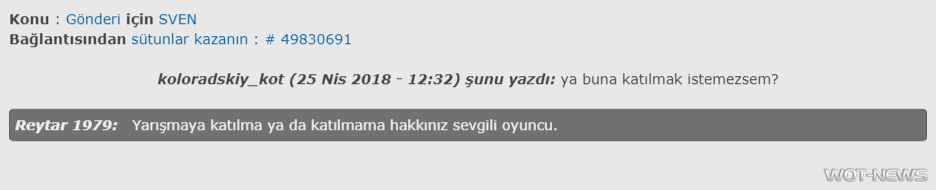 koloradskiy_kot (25 апр 2018 - 12:32) писал: а если я в этом не хочу участвовать? Reytar1979: Ваше право участвовать в конкурсе, или нет, уважаемый
