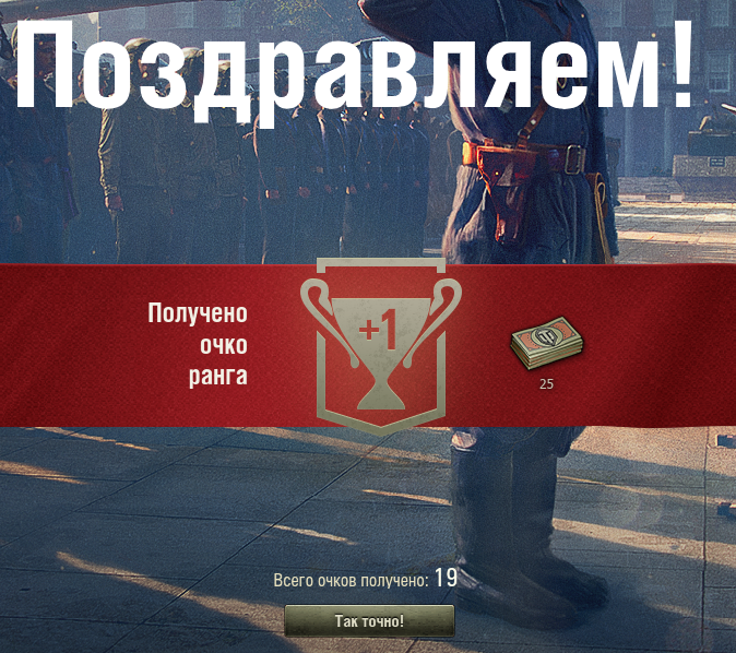 Roland_Diskein: Доброго вечера, танкисты. Весь день училенно работал, а дома решил поиграть немножк. Делюсь с вами результатами - все прошло весьма успешно. Смог поднять 4 ранга за 24 боя. Три последних катки были поражениями, но шеврон не терял, а в последней и вовсе заработал. В итоге вот такой результат и 757 место в таблице лидеров.