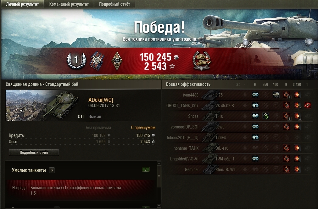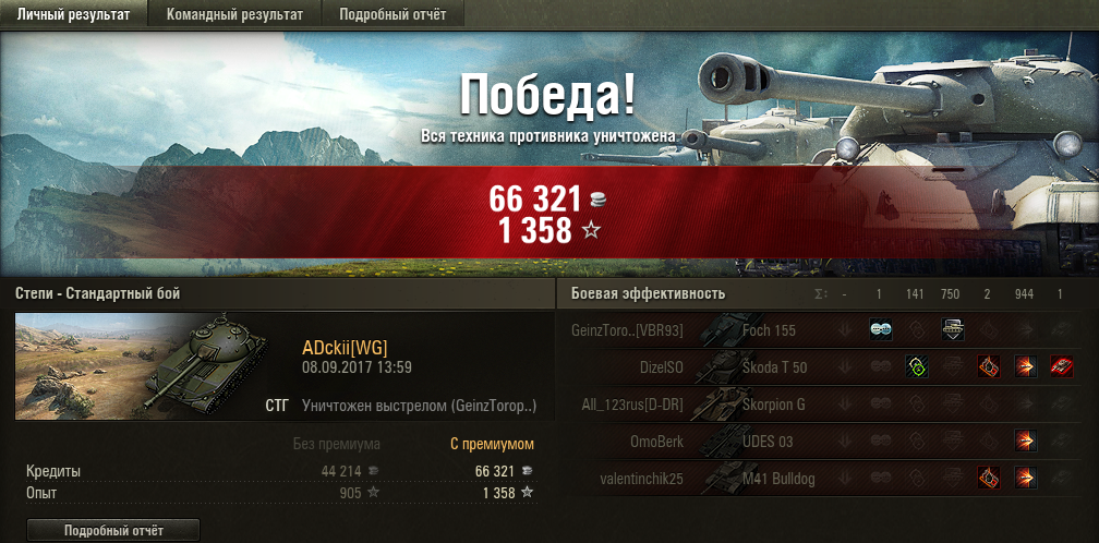 Просмотр сообщенияzveroboy43rus (08 Сен 2017 - 14:03) писал: Выложил один скрин и всех убедил какой классный танк?!. Ну а теперь выложи обычный,самый средний результат боя,а не свой самый "козырный".....ох уж ты сказочник....