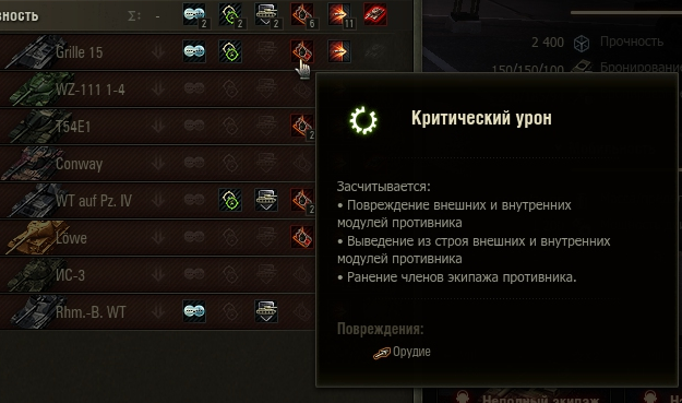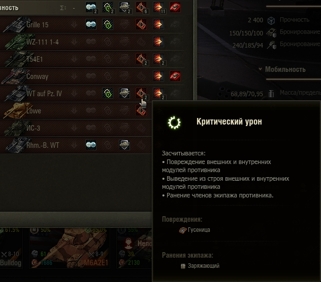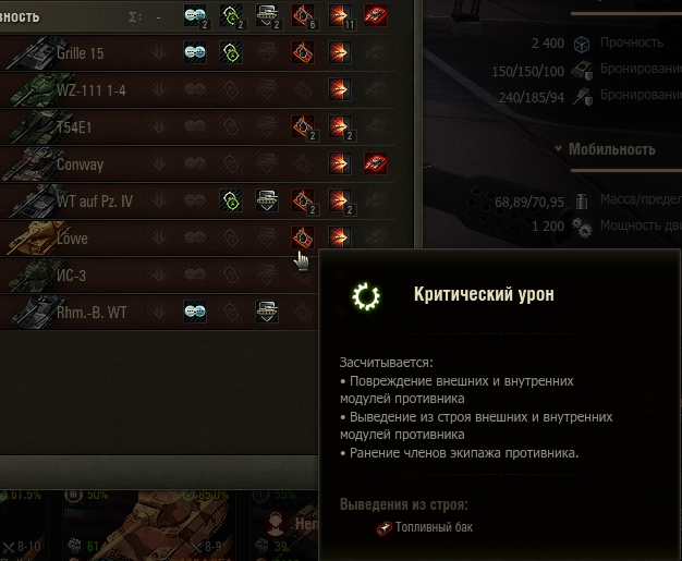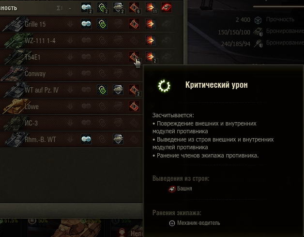 Excelion:   Вы не выполнили условия задачи. Как уже ответили выше к внутренним модулям относится: Двигатель (двигатель и трансмиссия являются одним модулем); Боеукладка; Бензобак; Механизм поворота башни; Радио; Экипаж — все члены экипажа являются внутренними модулями. По результатам боя видно, что из 6 критических повреждений, только 4 внутренних модулей. Удачи в боях.   Закрыто.