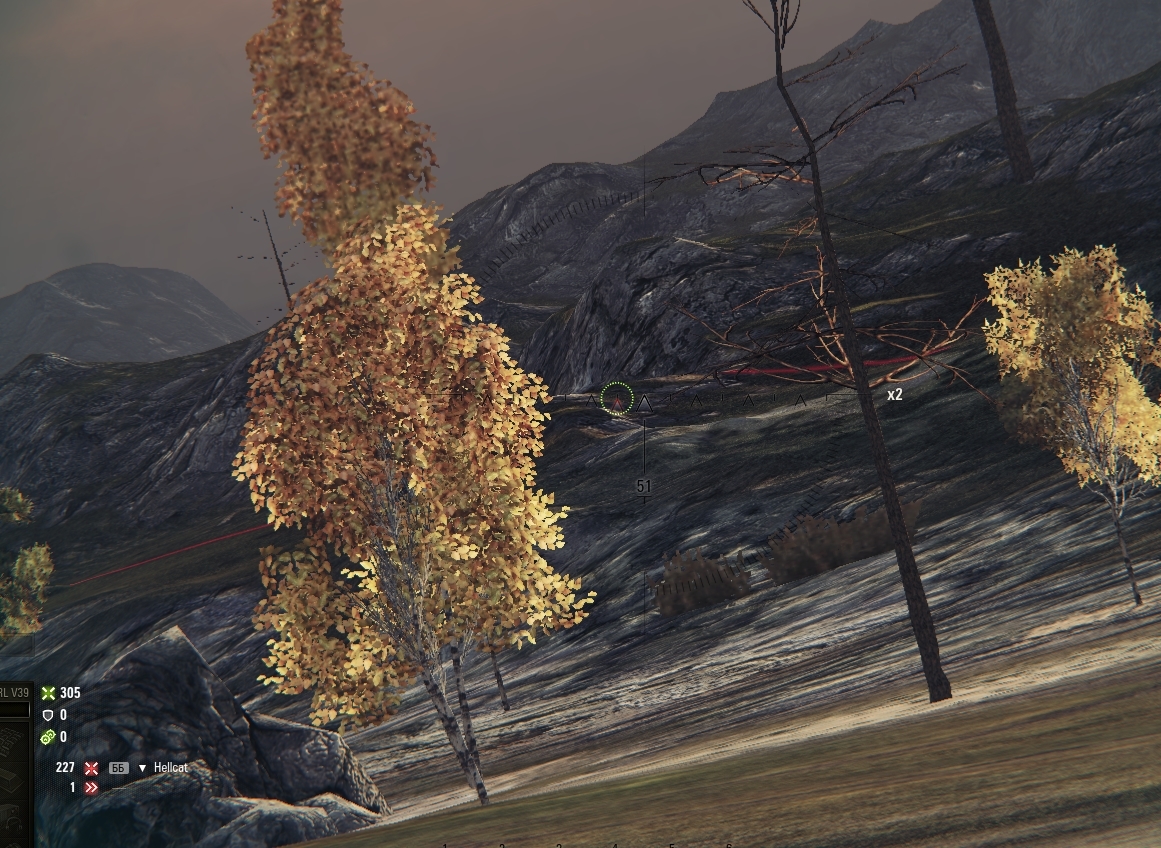 Просмотр сообщенияlx2 (03 Авг 2017 - 14:33) писал:   хеллкат стоял не в поле, а за кронами деревьев, вот тут примерно:   так что между вами две кроны деревьев, которые не дают тебе его засветить.   с сеткой и трубой он легко может стрелять через эти два куста и не светиться, а тебя светить. тем более, что у тебя даже лампа не выкачана, не то что другие перки...