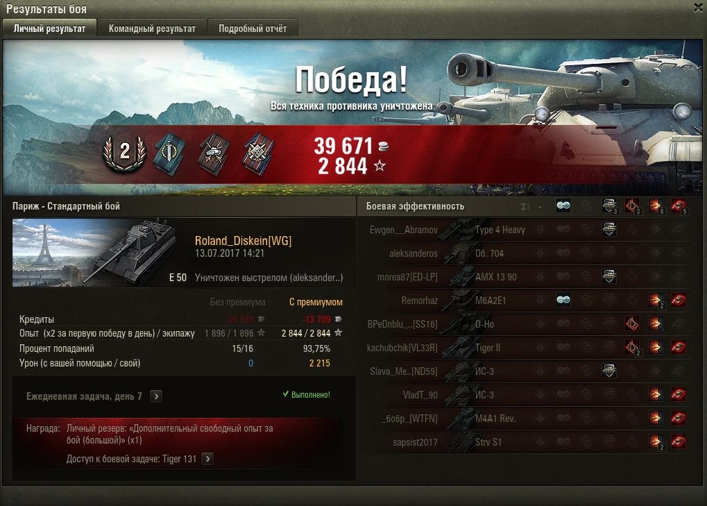 Roland_Diskein: А я уложился в 1 бой. Сделал пятый фраг за 3 секунды до плюхи от об. 704 и ухода в ангар :)