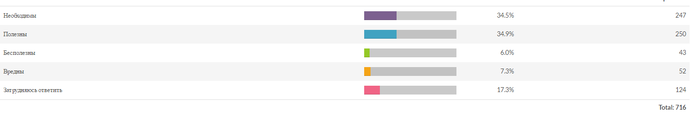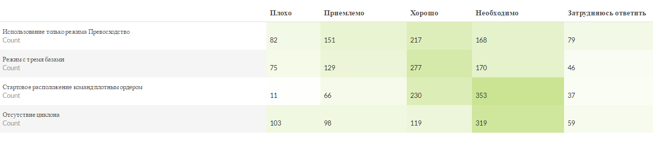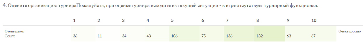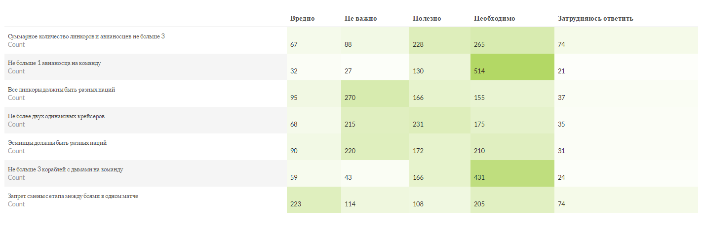 Tarki_Tau: Всем привет! В прошлую пятницу, участникам турнира было предложено пройти опрос о прошедшем турнире.  Большое спасибо тем 833 участникам турнира (из 1565), кто уделил немного своего времени и ответил на вопросы.   Далее будут приведены результаты опроса:    Общая информация:   Опрос прошло 833 участника. Из них 724 прошли опрос до конца (за что этим людям отдельная благодарность).   519 человек участвовало в групповом этапе и 269 человек участвовало в финальном этапе.    16 человек так и не приняло участие в боях и 27 вообще не поняли, о каком таком турнире идет речь.    352 игрока ранее принимало участие в турнирах.    566 - будут принимать участие в следующих турнирах   Оценка организации турнира.    Из комментариев в этом вопросе можно сделать вывод, что турнир понравился по следующим причинам: 1. Сам факт проведения турнира 2. Множеством команд 3. Меньше спорных вопросов чем в "Сезоне ураганов" 4. Адекватный регламент. 5. Набрали одинаковое количество баллов комментарии "Ничем" и "Всем".   Топ 5 причин, по которым не понравился турнир: 1. Отсутствие турнирного функционала 2. Слишком растянут по времени 3. Призовыми за финальный этап. 4. Обилием дымов. 5. Ничем.   Оценка работы судей.     Оценка формата 9х9.     Количество запасных игроков в команде.     Какой формат боёв (по количеству игроков в бою) Вам кажется оптимальным для проведения турниров?     Какие уровни кораблей подходят/оптимальны для турнирных матчей?     Время проведения матчей: В групповом этапе (будние дни)     В финальном этапе (выходные дни)     Турнирные карты.     Основными негативными комментариями про карты были: 1. Слишком маленькая (Новый Рассвет, Линия разлома, Трезубец, Соседи) 2. Слишком большая (Ловушка) 3. Отсутствие симметрии, что дает преимущество тому или иному респу.   Опрос на тему, какая бы карта хорошо подошла для турнира показал что наиболее популярной картой, на которой хотели бы играть оказался Океан. По остальным картам голоса распределились равномерно. Наиболее популярным пожеланием было создание симметричных карт для турнира.   Турнирные группы "Восток", "Центр" и "Запад".     Ограничения по сетапу.     Самыми популярными комментариями к сетапам были: 1. Ограничение кораблей с дымогенераторами до 2 штук (80% комментариев). 2. Ограничение крейсеров до максимум 2-х одной нации (сделать невозможным брать 2 Кутузовых и 2 Чапаевых). 3. Сделать возможным смену сетапа между боями.   Иные параметры турнирного режима.     Самые популярные комментарии и пожелания: 1. Режим с двумя базами (самый популярный комментарий) 2. Режим Превосходство 3. Увеличение количества игроков (10х10, 12х12 и даже (!!!) 15х15 :) ) 4. Танковая "Атака - оборона".   Наиболее удобные дни для проведения боев (получился весьма забавный результат)     Наиболее удобное время для проведения боев     Надеюсь, что эта информация поможет не только нам, в организации официальных турниров, но и всем остальным организаторам. Продолжаем работу над развитием корабельного кибер спорта вместе! :izmena: