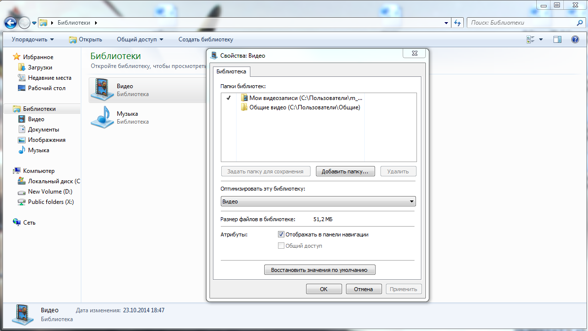ПКМ на папку "видео" -> свойства. Кнопка "добавить папку",